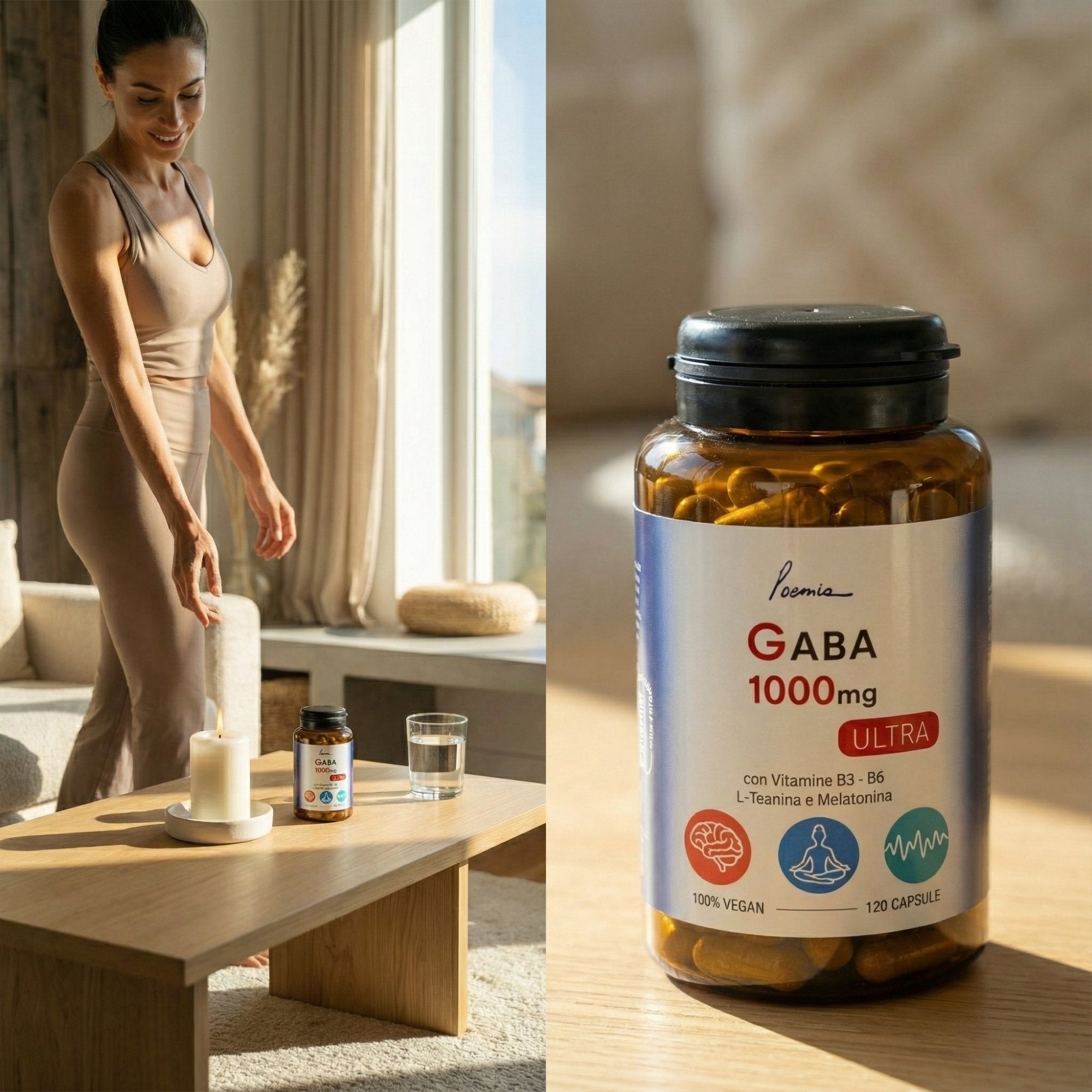 😌 GABA 1000mg + L-Teanina 90mg lavorano insieme per ridurre stress e ansia, favorendo rilassamento mentale senza sonnolenza diurna.
